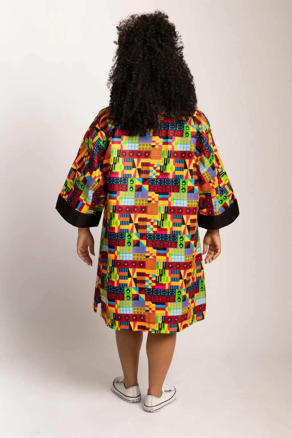 "Kimono - Estampa Ayo | Modelagem refinada e acabamento impecável, confeccionado com tecido africano autêntico e estampa exclusiva em tons terrosos. Uma peça versátil que transita com estilo entre o cotidiano e ocasiões especiais.