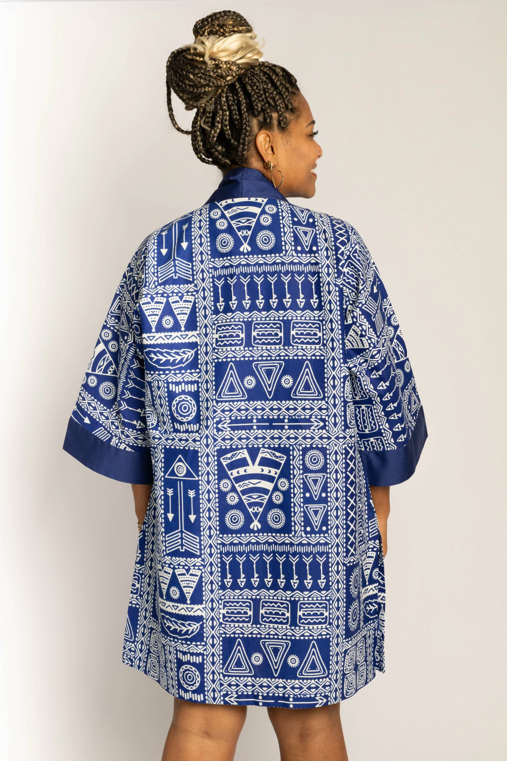 "Kimono - Estampa Maji | Modelagem refinada e acabamento impecável, confeccionado com tecido africano autêntico e estampa exclusiva. Uma peça versátil que transita com estilo entre o cotidiano e ocasiões especiais.